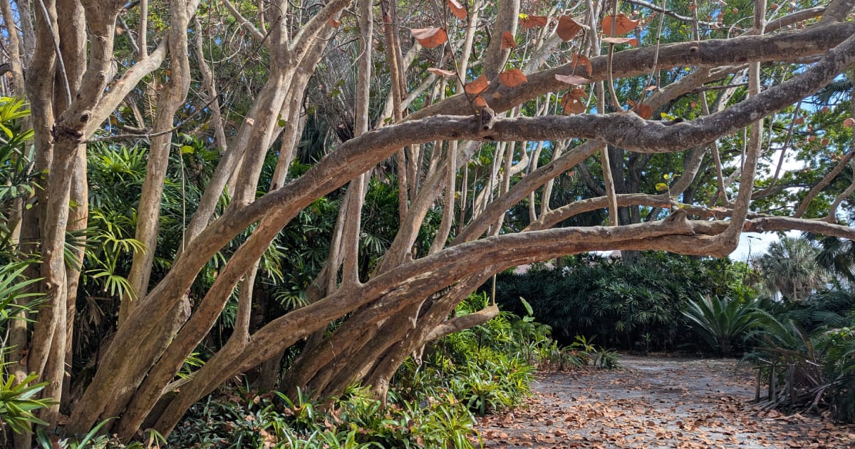 Finally, as you stroll back toward the entrance, enjoy the butterfly garden and the whimsical children’s garden before exploring the rainforest, as well as the palm and cycad walk. This area showed the most damage from the frost—especially visible in the immense sea grape tree pictured here. But even with the cold-weather damage, there was still plenty to see, and we enjoyed wandering through it all.