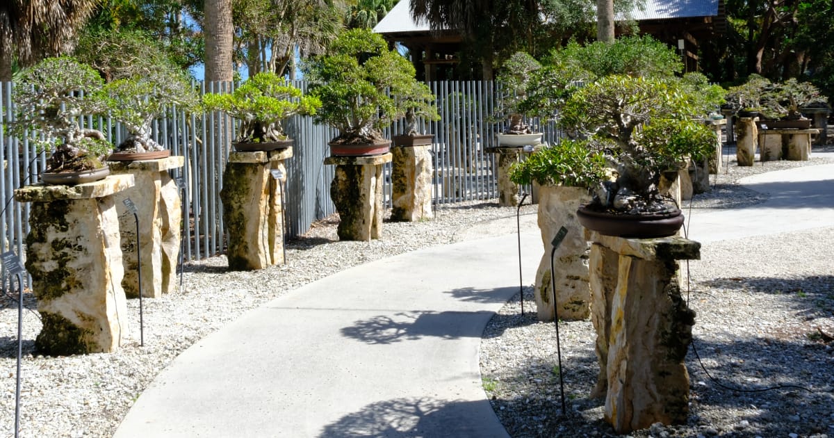 As you enter the gardens, to your right is the collection of over 100 bonsai. Bonsai Master Jim Smith donated them to ensure they would be cared for and protected. He pioneered the use of tropical species—including jade trees—as bonsai and successfully trained many Florida native species into bonsai form.